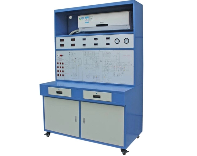 1.實訓(xùn)裝置直觀展示了熱泵型分體空調(diào)的系統(tǒng)結(jié)構(gòu)、工作原理,可清楚的看到制冷循環(huán)系統(tǒng)結(jié)構(gòu)及主要部件的實物,系統(tǒng)還配置有交流電壓表、交流電流表、溫度表、真空壓力表、信號燈及發(fā)光二極管使整個分體空調(diào)系統(tǒng)的實時工作狀態(tài)一目了然;主面板中間印有控制系統(tǒng)原理圖,并設(shè)有相應(yīng)測試點;便于教學(xué)演示講解及學(xué)生對課本知識的理解掌握。此外,管路中設(shè)有視液鏡可觀察制冷劑狀態(tài);高壓管路為紅色部分,低壓管路為藍色部分。相應(yīng)部件均有名稱標(biāo)識