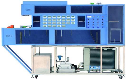 由一個模擬房間,和一個組合式風柜組成。模擬房間采用30*30工業(yè)標準鋁型材和雙面烤漆木板結構,內(nèi)部裝有和真實空調(diào)末端同樣的風機盤管,三級調(diào)速,由調(diào)整開關用戶自由調(diào)。組合式風柜系統(tǒng)由回風口,新空氣混合風口,送風機,中央空調(diào)蒸發(fā)器,管道,電磁閥組成。