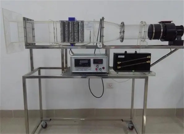 多翼式低噪音風機,自動調(diào)節(jié)風門,組合式有機玻璃風洞,翅片加熱管,加熱由固體調(diào)壓模塊配電位器調(diào)節(jié)加熱功率,數(shù)顯電流表、電壓表,翅片管簇順排和叉排組合,溫度傳感器,畢托管配差壓傳感器測量風量,16路萬能信號輸入巡檢儀顯示溫度、阻力、流量,不銹鋼支架。
