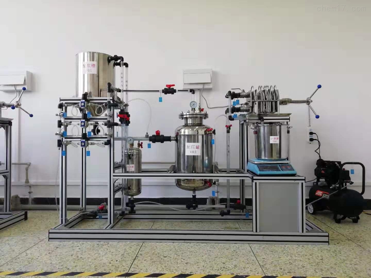4、該實(shí)驗(yàn)裝置是由過濾板、過濾框組成的小型工業(yè)用不銹鋼板框過濾機(jī),能完整地體現(xiàn)了板框壓濾機(jī)的構(gòu)造和操作流程,采用無噪音壓縮機(jī),采用氣動(dòng)配料、氣動(dòng)攪拌加壓技術(shù),操作簡(jiǎn)單。