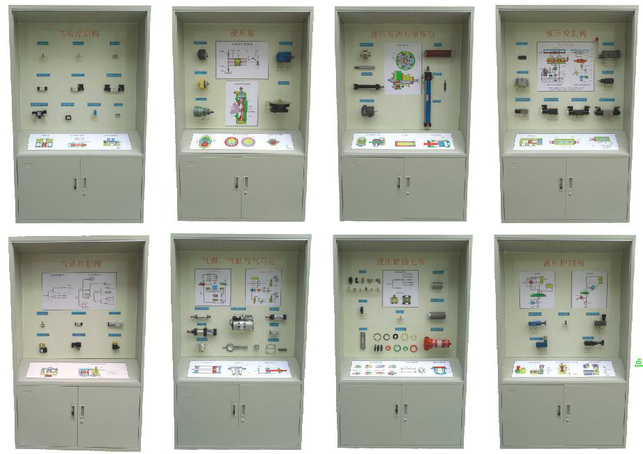 氣動(dòng)液壓元件陳列柜采用實(shí)物或模型以及必要的圖文資料展示常見液壓、氣動(dòng)元件的基本類型與基本結(jié)構(gòu)。氣動(dòng)液壓元件陳列柜每個(gè)模型都配備文字標(biāo)牌。