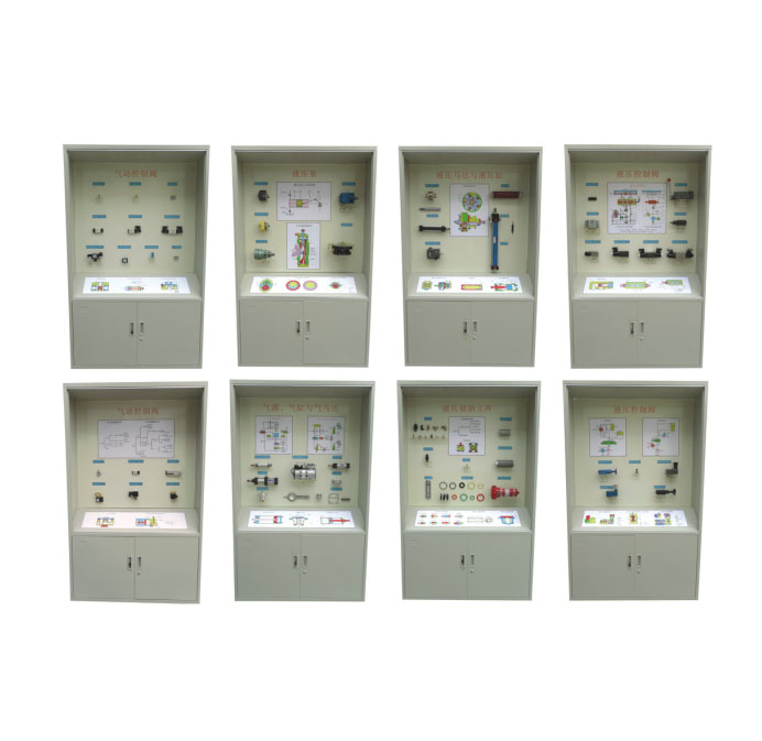 氣動(dòng)液壓示教陳列柜是為了滿足大、中院校的教學(xué)需要,根據(jù)相關(guān)教材編制設(shè)計(jì)的現(xiàn)代教學(xué)設(shè)備,其中主要以實(shí)物或模型以及必要的圖文資料展示氣缸,控制閥,液壓泵,馬達(dá),控制閥等相關(guān)元件的基本類型與基本結(jié)構(gòu)。