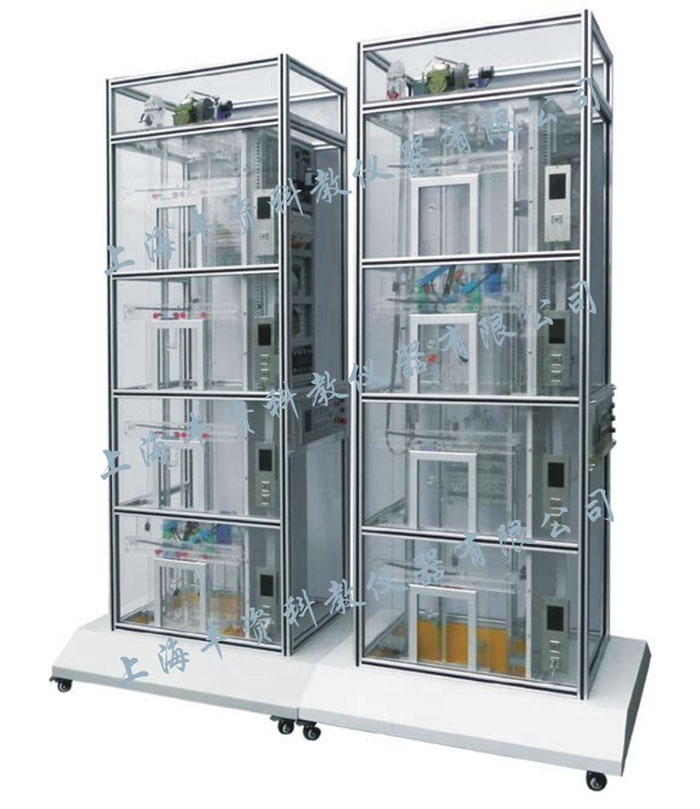 1、由兩臺四層透明仿真教學客梯組成,由層外兩處按鈕共同控制。