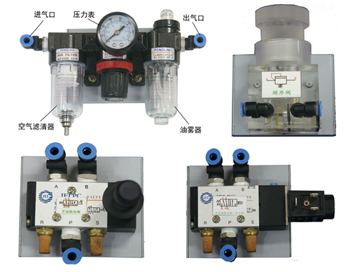 空氣過濾、減壓、油霧器三聯(lián)件,減壓閥,手動換向閥,電磁換向閥,氣控換向閥,行程閥,單向閥,節(jié)流閥、單向節(jié)流閥、快速排氣閥,或門 型梭閥,單作用氣缸,雙作用氣缸、旋轉(zhuǎn)氣缸,行程開關(guān)(常閉、常開)等。